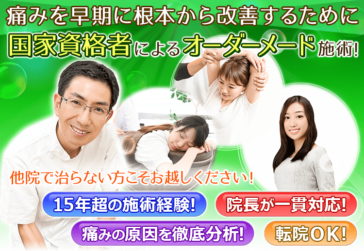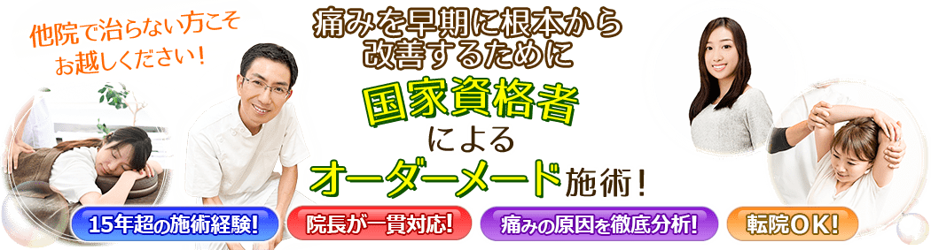 これまでの経験やお身体の状態をもとに、その人に合った施術方法で根本改善を目指しますので、お身体のお悩みは当院にお任せください。